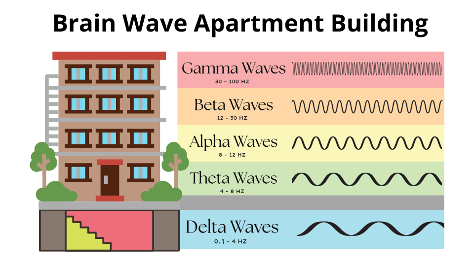 Think of brainwaves as occupying different floors of a building. Each floor corresponds to a frequency range and a particular state of consciousness: